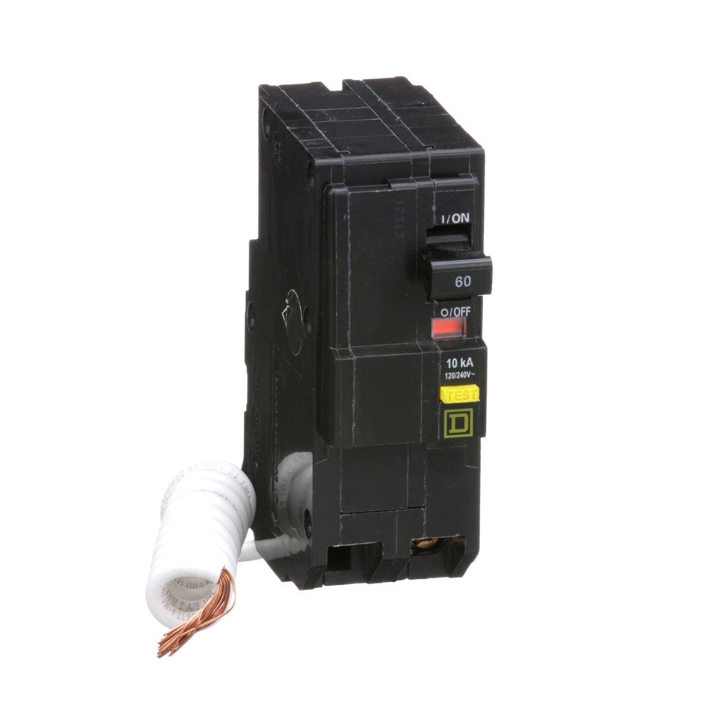 QO and QOB one, two and three pole thermal magnetic circuit breakers provide overcurrent protection and switching on ac and dc systems. These circuit breakers have an over center, trip free toggle mechanism with quick make, quick break action and positive handle indication. They also have VisiTrip trip indication, which provides a visual indication that the circuit breaker has tripped and interrupted the circuit. A full line of features and factory installed accessories are also available such as shunt trips, auxiliary switches and alarm switches. This 2 pole QO circuit breaker is rated at 60A at 120/240VAC. This unit provides 10kA breaking capacity and plug in mounting. This product includes a 6mA ground fault A with pigtail. This product includes a 6mA ground fault A with pigtail. QO circuit breakers are UL Listed under UL File E84967 and are CSA Certified under CSA Master Contract 153555.
