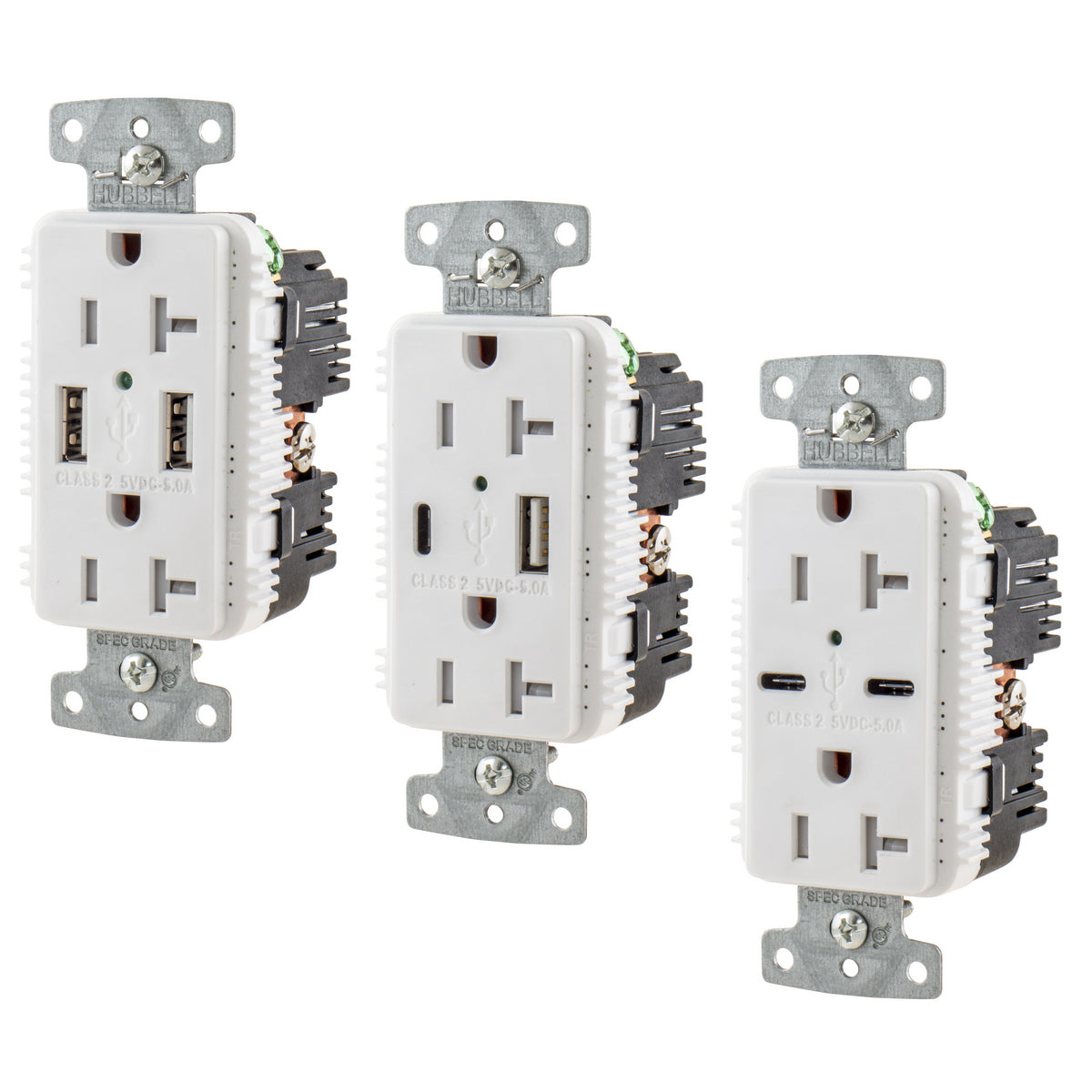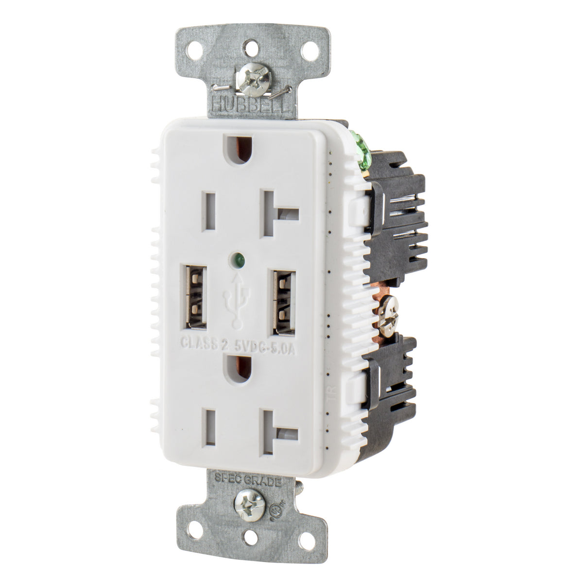 Hubbell USB Charger Duplex Receptacle, 20A 125V, 2-Pole 3-Wire Grounding, 5-20R, 2) 5A USB Ports, White, Model USB20A5W