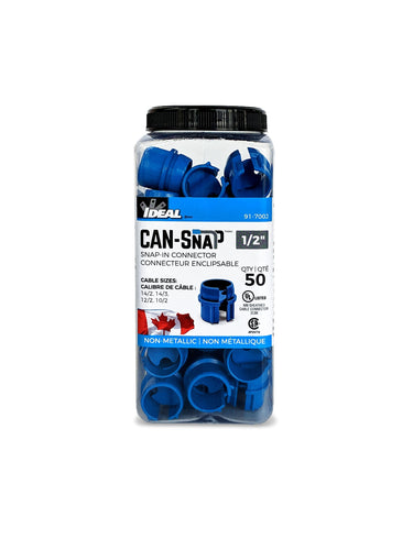 IDEAL® Can-Snap™ Non-Metallic Snap-In Connectors offer exceptional performance and incredible value. Designed for quick and easy installation, these connectors simply snap in with no tools required, making them faster and easier to install than traditional cable clamps. They securely hold cables in place, providing superior protection from damage caused by rough knockout edges of electrical boxes and panels, while also offering necessary strain relief. Suitable for 1/2" knockouts, these connectors can secure NM (Romex®) cable sizes 14/2, 14/3, 12/2, and 10/2. The sizes are color-coded for quick identification, and come in convenient jar packaging. Proudly made in Canada, these connectors are CSA Certified and UL Listed.