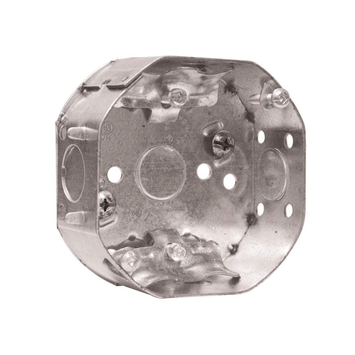 4 In. Octagon Box, 1-1/2 in. Deep, 15 Cu. In., with Raised Ground Screw, 1/2 in. KO, Cable Pryouts, NMD90