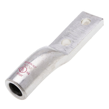 Tin-plated aluminum lug for terminating 500 MCM conductors. Compatible with aluminum and copper wire, featuring a narrow tang and dual mounting holes for secure installation.