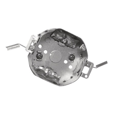 4 In. Octagon Box, 1-1/2 in. Deep, 15 Cu. In., with Swing Arm Rework Bracket, Flush Ears, Raised Ground Screw, 1/2 in. KO, Cable Pryouts, NMD90